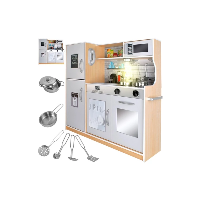 Dřevěná hrací kuchyňka se zvukovými a světelnými efekty a zajímavými doplňky, 80 x 80 x 24 cm, světle hnědá a bílá Děti jsou přirozeně zvědavé a rády napodobují ostatní. Učí se pozorováním a hrou. Dřevěná kuchyňka je fantastický způsob, jak mohou malé děti trávit čas hraním vzrušujících rolí, přípravou jídla a cítit se jako dospělí. Hrací kuchyňka má také vzdělávací funkci a je skvělým způsobem, jak zahnat nudu, zejména když je venku špatné počasí. multifunkční velká kuchyňka zaručuje hodiny zábavy. Tento velký kus nábytku, který obsahuje pracovní desku, police, skříňky, osvětlení, dřez, myčku, mikrovlnnou troubu, troubu a lednici, umožňuje mimořádně zajímavou a zábavnou hru. Pohyblivé prvky, otevírací dvířka, odnímatelný dřez a světelné a zvukové efekty zpestřují hru. Součástí sady je také nádobí, příslušenství a telefon. Výrobek má velmi atraktivní design. Pečlivé a estetické zpracování s důrazem na nejmenší detaily mu dodává vysokou kvalitu a lahodí oku. Bílá barva v kombinaci s elegantní světle hnědou barvou činí z kuchyňky krásnou dekoraci dětského pokoje. Výrobek je vyroben z vysoce kvalitního dřeva, které zajišťuje výjimečnou odolnost a dlouhou životnost, je bezpečné a má pozitivní vliv na vývoj nejmenších. velká kuchyňka je vybavena ...