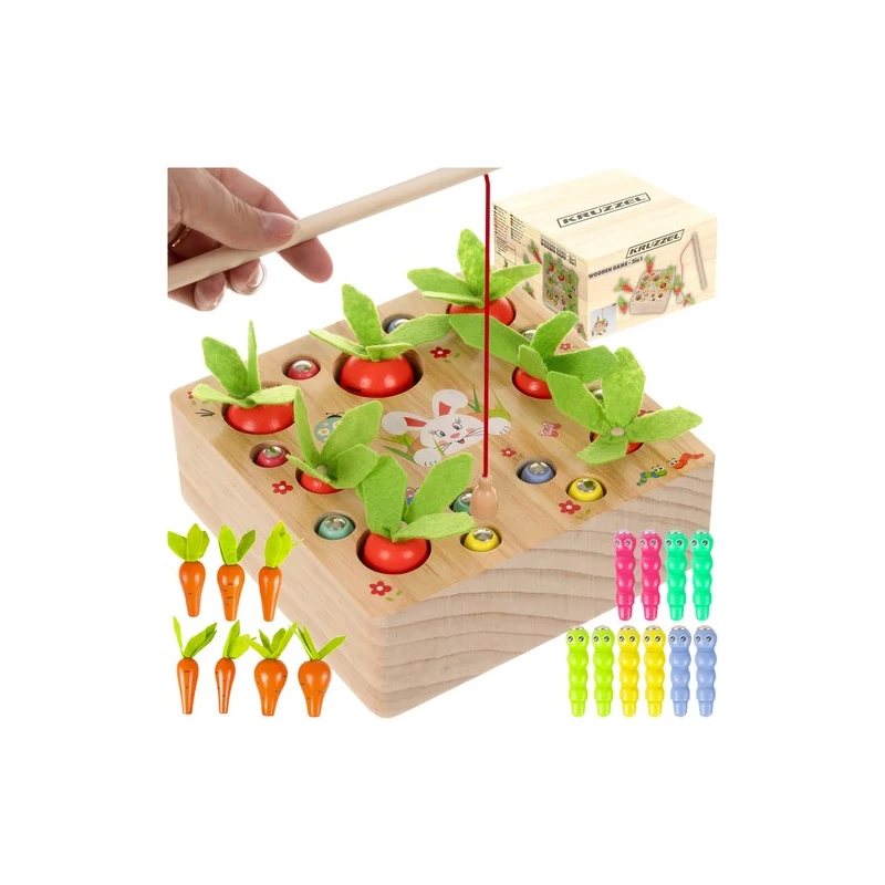dřevěná vzdělávací hra 2 v 1, zeleninová zahrádka se sběračem tvarů a magnetickým vytahovačem žížal Ve hře 2 v 1 děti sázejí mrkev přiřazováním k otvorům a pomocí magnetické tyčinky vytahují škůdce.Děti při hře na zeleninové zahrádce rády napodobují dospělé, mohou se stát malými zahradníky, kteří se starají o zahrádku. Péče o mrkev a odstraňování škůdců vytváří realistické situace. dřevěná hračka je skvělým způsobem, jak se učit hrou. Děti se učí soustředit, rozpoznávat barvy a tvary, zlepšují koordinaci ruka-oko a rozvíjejí zručnost. navrženo s ohledem na bezpečnost nejmenších, všechny prvky jsou pečlivě zaobleny a vyrobeny z materiálů šetrných k životnímu prostředí, díky čemuž je sada zcela bezpečná jak pro dítě, tak pro životní prostředí. prvky jsou mimořádně trvanlivé a odolné vůči intenzivní hře, což dětem poskytuje hodiny vzrušujících a zábavných aktivit. Dřevěná hračka je ideálním nápadem na dárek pro všechny zahradníky ve věku 3-7 let.vlastnosti:doporučený věk: 3-7 letmateriál: dřevo, plsť, magnet, polyesterrozměry: 14 × 14 × 5 cmhmotnost: 0,448 kghmotnost v zabaleném stavu: 0,605 kgobsah balení:dřevěná deska7 mrkví10 žížalrybářský prutobsah balení