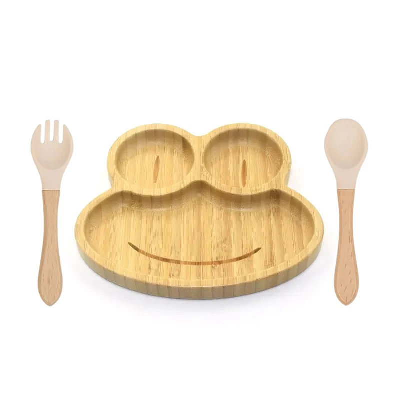 Elite Home® bambusový talíř ve tvaru žáby s přísavkou, sada dětských příborů se silikonovou lžičkou a vidličkou, sada 3 kusů
