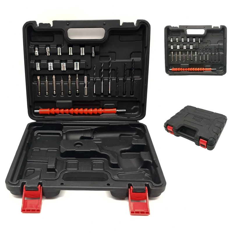 Akumulátorový kufr na vrtačky, s vrtáky, bitovými hlavami a příslušenstvím, sada 25 kusů, černý Kufr je určen k ukládání a přenášení akumulátorových příklepových vrtaček a šroubováků. Kromě elektrického nářadí má dostatek prostoru pro 2 akumulátory a nabíječku. kufr obsahuje 24dílnou sadu příslušenství pro prováděné úkony. Každý kus má svůj vlastní prostor, což usnadňuje výběr toho správného a zároveň udržuje pořádek. příslušenství zahrnuje vrtáky, krouhací hlavy, prodloužené hlavice a prodlužovací stopky. Kufřík lze uzavřít dvěma uzamykacími sponami a díky pohodlné rukojeti se snadno přenášíVybavení:Úložný kufr s příslušenstvímMateriál: plastBarva: černáRozměry: 31 × 25 × 7,5 cmHmotnost s příslušenstvím: 970 gVelikost nářadí bez nasazené baterie:sada obsahuje: 1 úložný kufr3 vrtáky do dřeva (4, 5, 6)3 vrtáky do kamene (4, 5, 6)9 kovacích hlavic (5, 6, 7, 8, 9, 10, 11, 12, 13 mm)6 prodloužených hlavic2 prodlužovací bity1 flexibilní prodlužovací bit (hadí bit), který se vejde do všech malých mezer