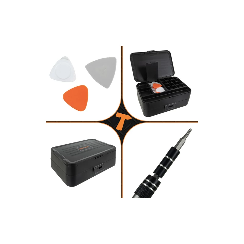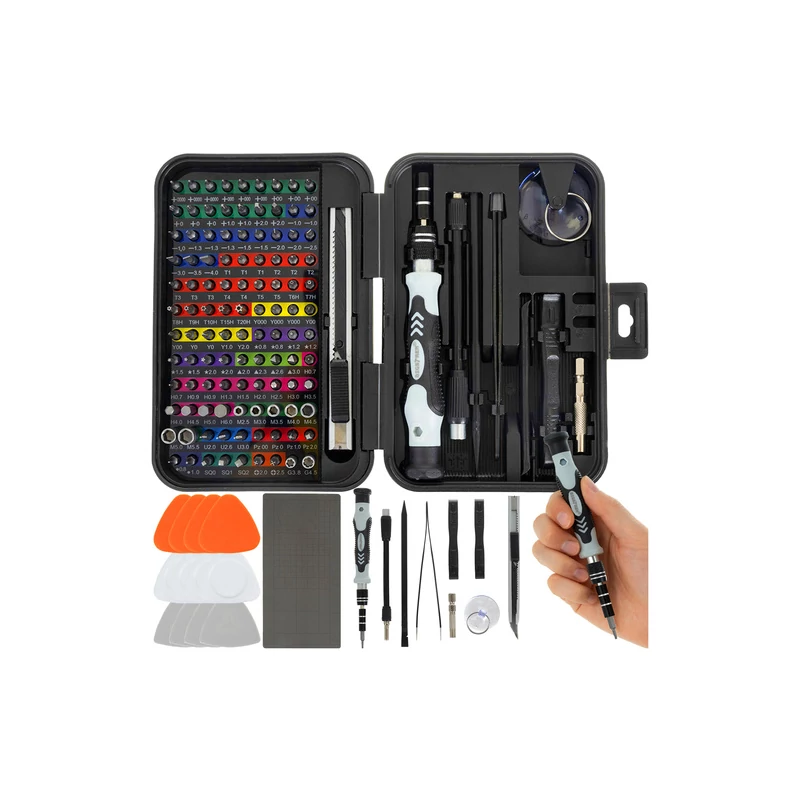 - 108 ks bitů pro šroubováky CRV: (PH0000 až PH2, ploché: SL1 až SL4, šestihranné (Hex): H0,7 až H6,0, zásuvky: M2,5 až M5,5, G3,8, G4,5, Torx a Torx s otvorem: T1 až T20H, trojúhelník, pentalobe, trojúhelník, čtverec, Pozidriv, U-tvar atd. Jehly na vyjmutí SIM karty: SIM0,8, SIM1,0, Distanční bity: 2,0, 2,5)