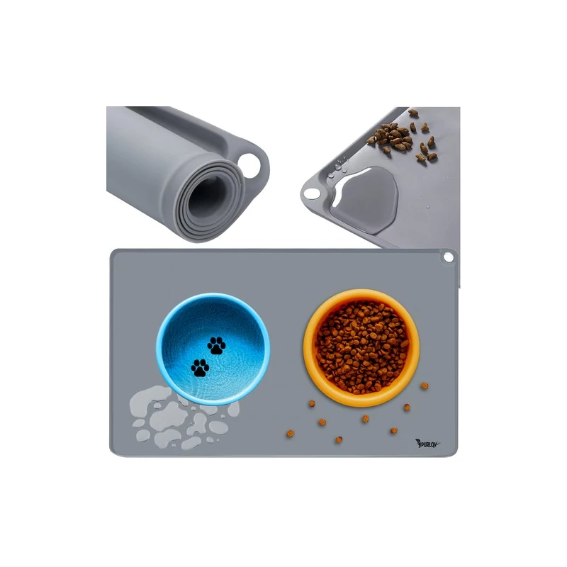 Silikonová podložka pod misky na krmení a pití pro psy/kočky s protiskluzovým povrchem, 60 × 45 cm, šedá Podložka je velmi praktickým řešením, které chrání podlahu, když váš mazlíček jí, a udržuje misky na svém místě. Kvalitní silikon nevydává žádné nepříjemné pachy, takže vašeho psa neodradí od konzumace jídla. podložka je vyrobena z kvalitního a odolného silikonu, který snadno odolává každodennímu používání a kontaktu s vodou. Silikonová podložka XXL má rozměry 60 × 40 cm, takže se na ni vejdou 2 misky různých velikostí, aniž by zabírala příliš mnoho místa na podlaze. podložka účinně zabraňuje sklouznutí misek, i když váš pes intenzivně jí. Zvýšený okraj účinně zadržuje rozsypané tekutiny a zbytky jídla. Chrání podlahu před znečištěním a usnadňuje udržování čistoty v okolí misek. podložka se snadno udržuje v čistotě, takže zbytky jídla a rozsypané tekutiny snadno odstraníte jednoduchým vysypáním zbytků a otřením hadříkem.Vlastnosti:Barva: šedáMateriál: silikonPoužití: pro psy a kočkyVoděodolný materiál a provedeníProtiskluzová konstrukceMožnost umístění dvou misekRozměry: 60 × 45 × 0,6 cmHmotnost: 0,322 kgHmotnost s obalem: 0,339 kgObsah balení:1 silikonová podložka